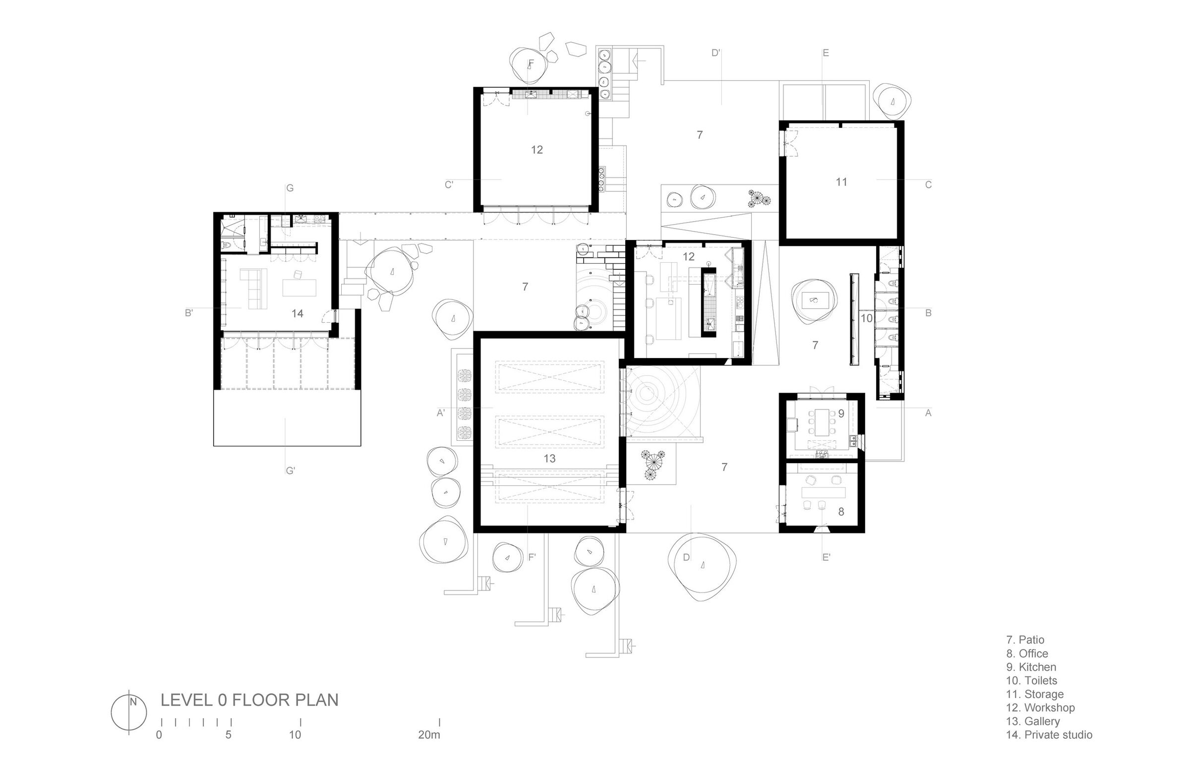 The completed Casa Ballena is a complex of rectangular rammed earth volumes connected by wooden pergolas. The structures vary in height relative to surrounding views and the sloping of the site. They seem to dance about the hillside, some lightly touching to create interior connections, others distanced to produce generously-sized outdoor patios finished in gravel and stone and planted with native desert vegetation. The center’s program consists of three workshops, an exhibition gallery, dining and living halls and a warehouse, each inhabiting a volume that is oriented according to its function: workshops are positioned to face northward, while the living and dining halls, administrative area, and residences face southward with views to a nearby marina.