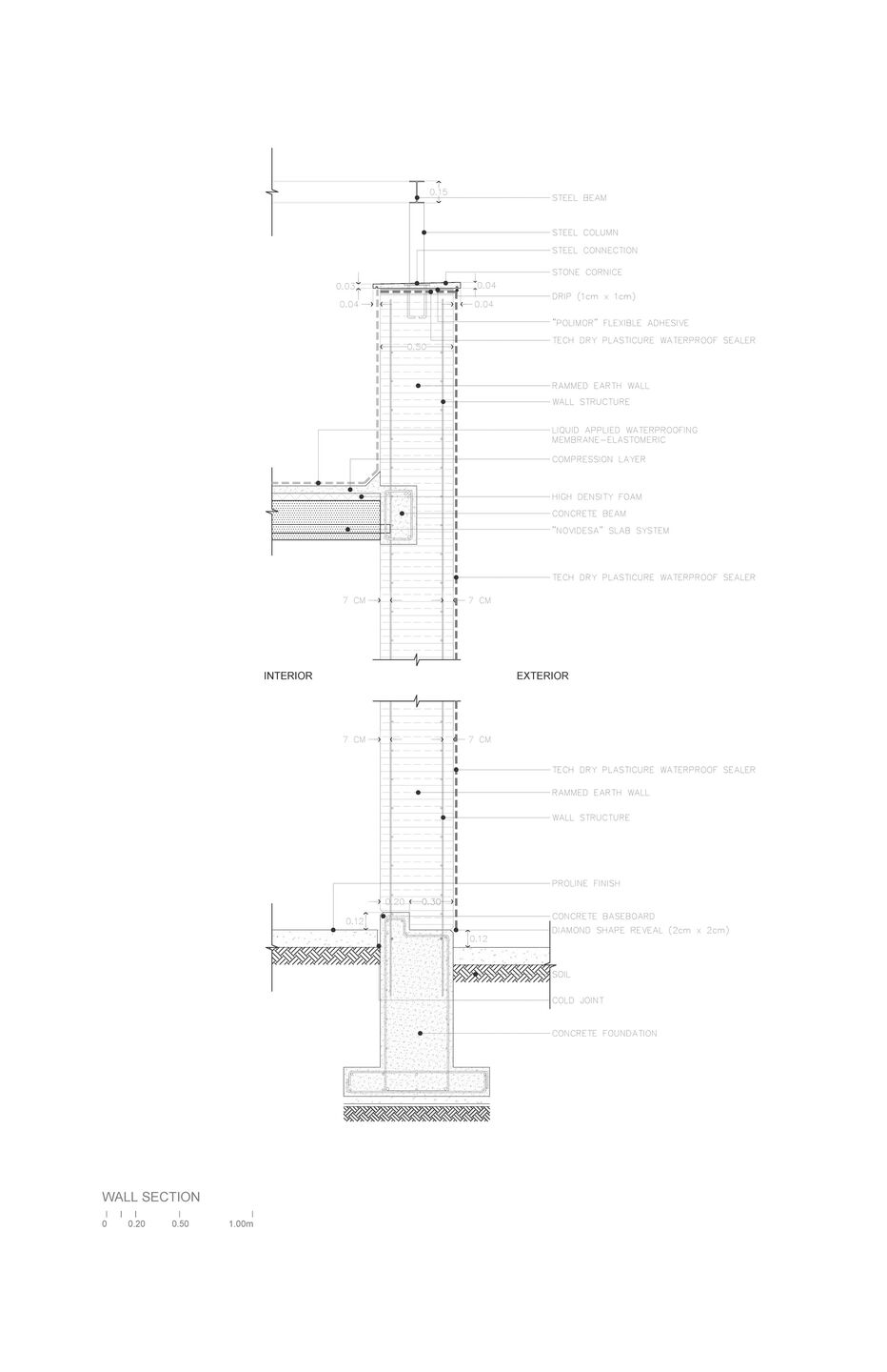 After the first major rainfall during construction, the architects resolved some potential waterproofing issues at the roof level by inverting the perimeter concrete beam that rests inside the rammed earth walls. This allowed the waterproofing to transition from horizontal at the slab to vertical at the parapet wall, thus reducing the infiltration at the structural joints. “The biggest mistake is letting your walls get wet from above,” says Rivero. “They can get wet on the side, but if they get wet from above it, the water can get into your structure, and into the spaces.”