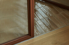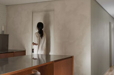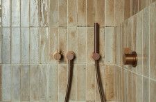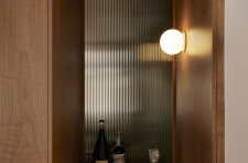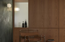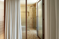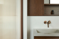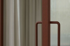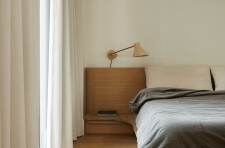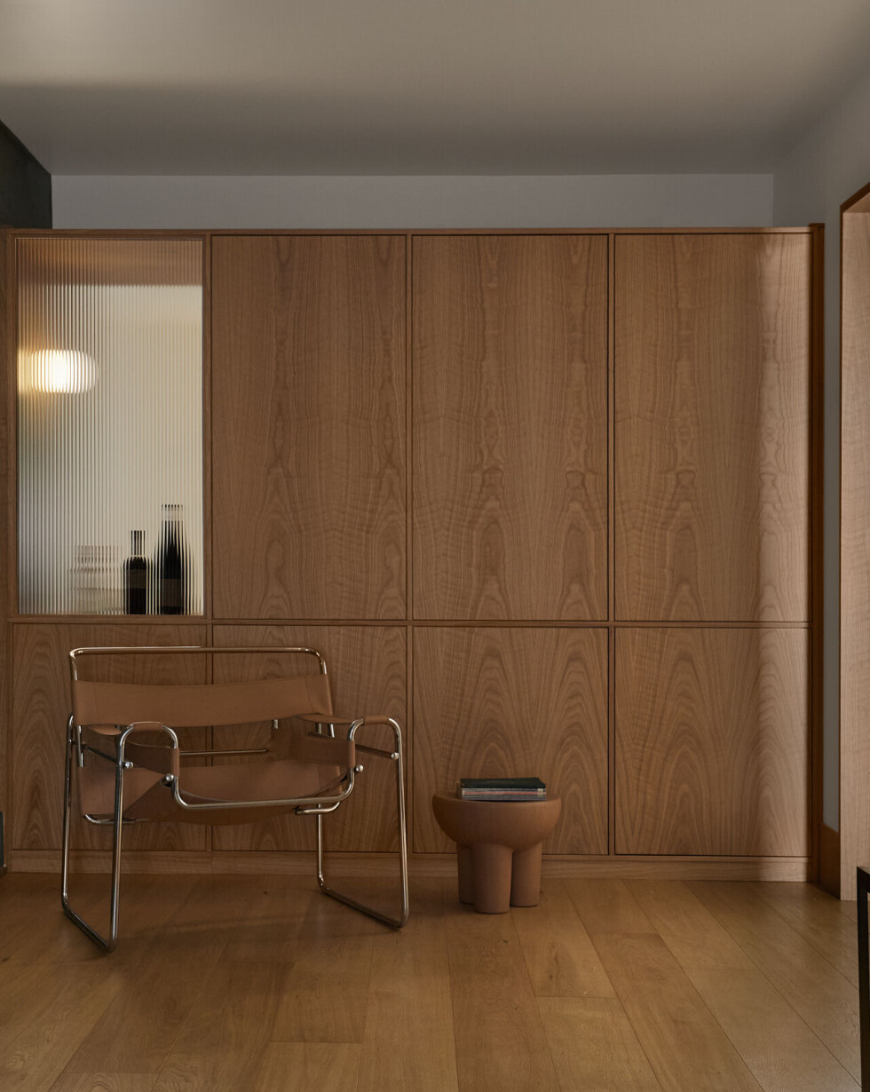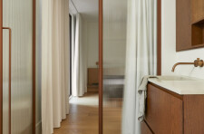 The private areas of the residence are accessed via a staircase that has been preserved from a previous renovation. On the street side, the laundry room, common bathroom and the two secondary bedrooms are organized. Divided by the stairwell overhung by a well of light, the new master suite opens onto the courtyard. It is through a terracotta-colored glass partition, modulated with an integrated curtain, that we are welcomed in the master bedroom where the white oak wood is declined from the floor to the furniture. The bathroom, partitioned with the same terracotta steel work, gives way to a harmony of textures and tones composed of beige glazed tile, dark stained wood accented by copper plumbing.